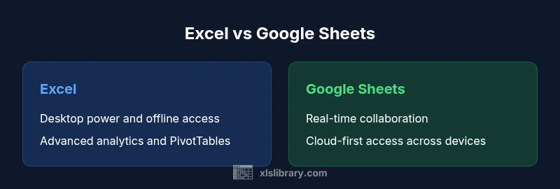 According to XLS Library, the Excel vs Google Sheets decision hinges on collaboration needs, data volume, and preferred work style. Excel remains the heavyweight on the desktop, offering powerful data modeling, extensive add-ins, and strong offline capabilities. Google Sheets is the cloud-first option designed for teams who edit together in real time, share easily, and work across devices with minimal friction. The XLS Library team found that most day-to-day tasks sit at the intersection of these axes: if your work is heavily spreadsheet-driven, involves large datasets or complex analytics, or requires offline access, Excel is usually the better choice; if your priority is live collaboration, cross‑device access, and seamless cloud storage, Sheets often wins. In practice, many organizations operate in a hybrid model, using Excel for heavy analysis and Sheets for planning and coordination. In this article, we’ll evaluate the two products across key dimensions—feature depth, collaboration, data handling, automation, interoperability, and total cost of ownership—so you can pick the one that aligns with your goals.