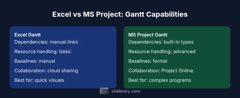 When teams plan projects, a clear timeline of tasks, durations, and dependencies is essential. A Gantt chart provides that visual map, turning lists of activities into a coherent schedule. For many organizations evaluating gantt chart excel vs microsoft project, the decision hinges on scale, collaboration needs, and governance requirements. According to XLS Library, organizations often start with a familiar tool to map tasks and milestones and only migrate to more advanced systems when complexity grows. The XLS Library team found that for small, straightforward projects, Excel-based Gantt charts can deliver quick clarity with minimal setup. For larger initiatives with multiple teams and interdependent activities, dedicated project management software delivers critical path analysis, resource leveling, baselines, and robust reporting. The result is that the right choice depends on project size, team maturity, and data governance.
