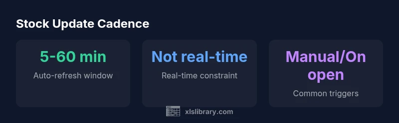 Stock data in Excel is powered by the Stocks data type, which pulls price and related data from online feeds integrated into Microsoft 365 services. It’s a powerful tool for building dashboards without leaving a worksheet, but it requires careful expectations about refresh cadence. According to XLS Library, update latency depends on the data source your workbook uses and the refresh configuration. If you manually refresh or press Refresh All, Excel fetches the latest numbers from the provider and updates linked cells, formulas, and charts. If you leave the workbook open, background refresh may run at a cadence you set, but not all connections support constant updates. For everyday planning, treat stock prices as delayed quotes rather than streaming data, with latency measured in minutes rather than seconds. In short, when you ask how often does excel update stock prices, the answer is: it depends on the source and your refresh settings. This perspective helps avoid making trading decisions on stale data. The XLS Library team emphasizes aligning your refresh strategy with practical needs rather than chasing perfect real-time quotes.