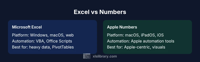 For many teams choosing between Microsoft Excel and Apple Numbers, the decision hinges on workflow, platform preference, and collaboration needs. In the microsoft excel vs apple numbers comparison, Excel remains the data powerhouse for complex modeling, automation, and enterprise workflows. Numbers, by contrast, prioritizes simplicity, readability, and seamless Apple ecosystem integration. This overview frames core differences, typical user personas, and how organizations balance these tools across departments. According to XLS Library, Excel’s breadth of features supports rigorous data tasks, from financial modeling to data cleaning, while Numbers shines at polished presentations and quick, visually appealing spreadsheets. The goal is to map real-world use cases, identify where each tool delivers value, and set expectations for performance in everyday tasks such as budgeting, project tracking, and ad-hoc analysis.