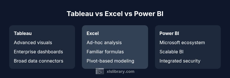 Tableau, Excel, and Power BI target different user groups within an organization. The landscape favors Tableau for dedicated analytics teams who require rich, interactive visuals and enterprise-grade dashboards. Excel remains the standard tool for many business users who perform ad-hoc analysis, modeling, and quick data tinkering within a familiar interface. Power BI sits between these two poles, offering scalable BI within a Microsoft-centric ecosystem and strong integration with existing data sources. According to XLS Library, understanding tableau vs excel vs power bi requires mapping data needs to the right tool for collaboration, governance, and deployment. This alignment matters most when teams must share insights across departments and maintain data consistency. The result is: choose the tool whose strengths align with your data strategy, governance standards, and organizational workflow.