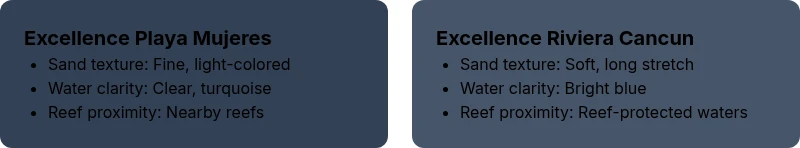 Excellence Riviera Cancun and Excellence Playa Mujeres generally offer the strongest beach experiences, with the best pick depending on your preferred coastline vibe.