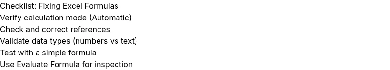 Adopt a repeatable process for any future formula issue. 1) Verify Calculation mode is Automatic. 2) Inspect the formula’s references for correctness and anchoring. 3) Confirm inputs are the right type (numbers vs text). 4) Test with a deliberately simple formula to see if basic arithmetic works. 5) Use Excel’s built-in Evaluate Formula to inspect parts of the expression. 6) If needed, adjust ranges and named ranges. 7) Re-check the workbook for hidden characters or external references that could derail results.