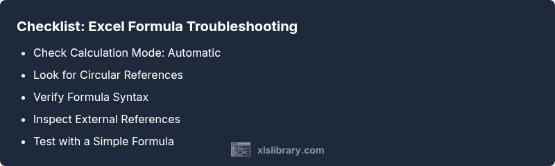 Take five minutes to run through this rapid checklist. First, press F9 to recalculate the active sheet and Ctrl+Alt+F9 to recalc the entire workbook. If you still don’t see updates, switch Calculation Options to Automatic from the Formulas tab. Next, search for potential circular references via Formulas > Error Checking. Finally, confirm that the cells referenced in your formula contain numbers or dates, not text that looks like numbers. A minor format mismatch often explains why excel won't calculate formula results. If you spot a named range, verify it resolves to a valid reference. These quick checks catch most traps before you dive into deeper diagnostics.
