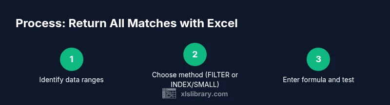 If you’re on Excel 365 or 2021 with dynamic arrays, FILTER is the simplest, most reliable way to return all matches. FILTER spills results automatically, returning every row that satisfies the condition. This works beautifully for single-column lookups or when you need the full row. The formula is straightforward: =FILTER(return_range, lookup_range=lookup_value, "No matches"). Add an optional if_empty argument to present a friendly message when there are no matches. In practice, FILTER makes dashboards and reports more interactive and easier to maintain. According to XLS Library analysis, organizations adopting dynamic arrays report faster model refreshes and clearer error handling across reports.