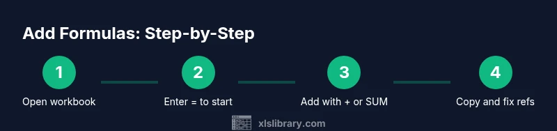 In Excel, adding in a formula means constructing an expression that produces a numeric result by combining values, cell references, and built-in functions. The simplest way to add is with the plus operator (+) or by using SUM for ranges. The goal is to make Excel evaluate your inputs and return a single value. According to XLS Library, understanding the difference between hard-coded numbers and cell references helps you build flexible, scalable calculations. When you create a formula, Excel automatically recalculates as you edit data, so your sheets stay up-to-date. In this guide, you’ll learn how to add in Excel formulas step by step, with real-world examples that you can apply in budgets, reports, and data analysis. The XLS Library team emphasizes starting with a clear objective and testing formulas on a small sample before applying them to large datasets.