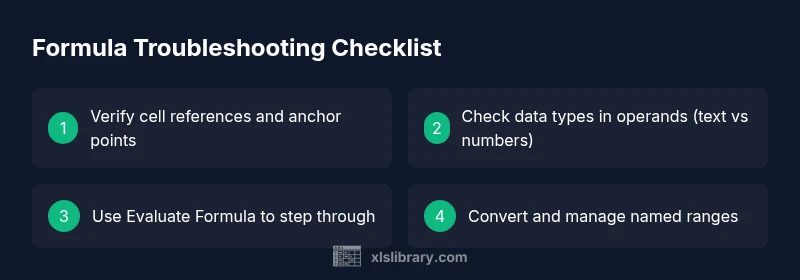 If you are staring at a puzzling result in Excel, you are not alone. The root of a problem with excel formula is often a tiny mismatch that echoes through the calculation. Common culprits include misused cell references, data type mismatches, or incorrect function syntax. The Excel calculation engine is precise; even a single shift in a relative reference can change dozens of results. In many cases, the issue starts with recent edits that moved or expanded a range without updating the formula accordingly. According to XLS Library, misreferences and data-type mismatches are among the most frequent causes, especially when data is imported from other sources or when ranges are adjusted after adding empty rows. To start solving, map out what the formula is intended to do and check each component against that intent. Is the range correct? Are you mixing text and numbers in a numeric operation? Are you using a function that requires a numeric argument but receiving text instead? By identifying the scope of the formula, you can prioritize the fixes that will impact the most results.