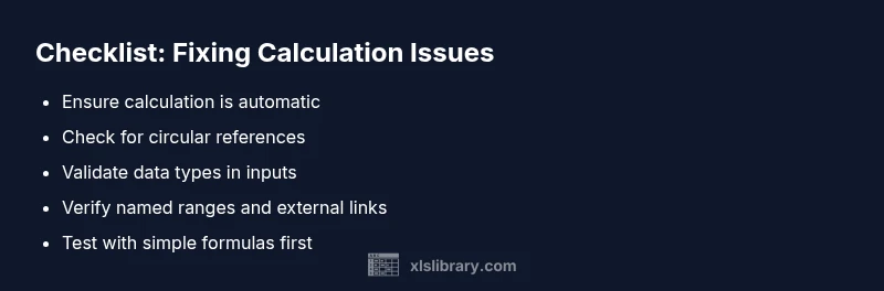 Excel occasionally stops calculating a formula, leaving you with stale results or errors. This issue is not rare and can stem from several root causes, including manual calculation mode, circular references, or data types treated as text. According to XLS Library, these are among the most frequent culprits and are fixable with a structured approach. In this guide you’ll find practical checks, clear steps, and antidotes you can apply on a real workbook without risking data integrity. By staying methodical, you’ll reduce guesswork and prevent reoccurrence in the future. The goal is not to patch symptoms but to restore reliable calculation so you can trust your numbers again. The XLS Library team emphasizes starting with the simplest changes and moving toward deeper auditing when needed.
