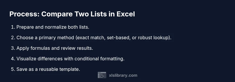 By combining exact-match checks, set-based checks, and robust lookups, you can build a resilient two-list comparison workflow. Keep a clean data foundation, document your formulas, and maintain a reusable template for recurring tasks. The resulting method scales from small lists to large datasets, offering clarity, accuracy, and speed in Excel. The XLS Library team recommends adopting this structured approach as your go-to practice for data reconciliation.