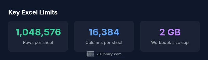 does excel go on forever? Not in practice. Excel has hard per-sheet limits: 1,048,576 rows and 16,384 columns, plus a 2 GB workbook size cap for .xlsx files. Real-world limits come from memory and hardware. When datasets exceed these, use data models or external databases.