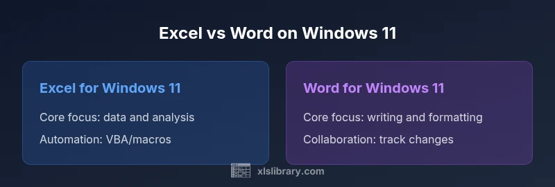 On Windows 11, both Excel and Word are part of the familiar Office ecosystem, yet they serve distinct purposes that shape how you approach daily tasks. Excel centers on data manipulation, numerical analysis, and automation through formulas and macros, while Word focuses on long-form writing, formatting, and collaboration. The transition to Windows 11 brings a refreshed touch interface, improved window management, and snappier responsiveness, all of which can influence your choice of tool for a given job. For professionals seeking practical mastery, understanding the chores each app is best at is essential. According to XLS Library, aligning your task with the right app on Windows 11 improves efficiency, reduces duplication, and minimizes workflow friction. This article uses a balanced, analytical lens to compare Excel and Word across common work scenarios and Office integrations, helping you decide when to rely on spreadsheets and when to compose documents.