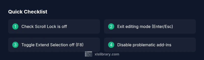 The XLS Library team recommends adopting a quick diagnostic flow whenever the arrow keys stop moving cells. Start with Scroll Lock, then verify editing mode and Extend Selection. If the issue persists, systematically disable add-ins and test with a new keyboard. With consistent checks and a saved baseline workbook, you can prevent this issue from interrupting your workflow in the future.