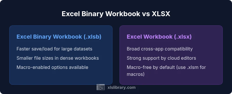 According to XLS Library, the Excel binary workbook (.xlsb) and the standard workbook (.xlsx) are two core file formats used by Excel 365, Excel 2021, and earlier versions. The binary format stores data in a compact, non-text form, which can improve speed for very large sheets, while the Open XML format (.xlsx) uses a zipped container of XML files to describe data, formulas, and formatting. The phrase excel binary workbook vs xlsx appears here to anchor the comparison for readers. Both formats share the same calculation engine and most Excel features, but their packaging affects performance, portability, and collaboration. The XLS Library team notes that the decision often hinges on practical workflow: speed and size versus broad compatibility and safe sharing. The .xlsx format is widely supported across office suites, cloud editors, and version control workflows, making it the default choice for teams that prioritize accessibility and interoperability. The .xlsb option, by contrast, is favored when you routinely work with very large datasets, complex formulas, or heavy automation. In the sections that follow, we’ll unpack the trade-offs with examples, best practices, and a decision framework you can apply to your own datasets.