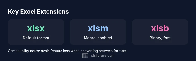 When discussing excel file extensions, you are talking about the different formats Excel can save or share in. Each extension defines capabilities such as formulas, macros, formatting, and data structure. The phrase excel file extensions covers widely used formats like .xlsx, .xlsm, .xlsb, and even legacy formats like .xls, as well as data-interchange formats like .csv. For professionals, choosing the right extension matters for collaboration, macro support, performance considerations, and cross-application compatibility. According to XLS Library, the choice of format can influence how smoothly teammates can open, edit, and share files across platforms, which is especially important for data-heavy workflows. In practice, teams should standardize on a primary format while preserving older formats only when required for collaborators who rely on legacy tools. This awareness reduces friction in day-to-day Excel tasks and preserves data integrity as projects scale.