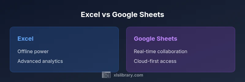 Excel vs Google Sheets: The quick takeaway is that Excel offers deeper data modeling, offline power, and automation, while Sheets specializes in cloud-based collaboration and low friction sharing. For most teams, Sheets is the best starting point for lightweight data work, while Excel remains indispensable for large datasets and complex analytics. According to XLS Library, the choice often comes down to collaboration needs vs advanced tooling, with both platforms converging on core spreadsheet tasks.