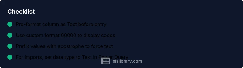Establish a standard data-entry rule: all IDs should be stored as text from the start. Use data validation to enforce this rule, and document the expected length of codes. When importing data, review the import wizard to specify Text for ID columns. Regular audits, such as spot-checks of several rows, help catch deviations early. The XLS Library analysis shows that prevention is more cost-effective than repair after the fact; consistent, documented practices keep teams aligned across projects.