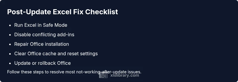 Most likely cause is a corrupted cache or problematic add-ins triggered by the update. Quick fix: start Excel in Safe Mode, disable all add-ins, and reset the Office cache. If needed, repair Office, install pending updates, or roll back the update. These steps solve the majority of Excel not working after update issues.
