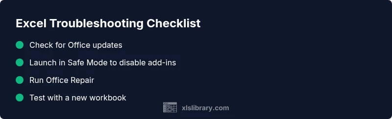 Struggling with Excel not working today? This XLS Library guide walks you through fast checks, diagnosis, and fixes to restore your spreadsheets quickly.