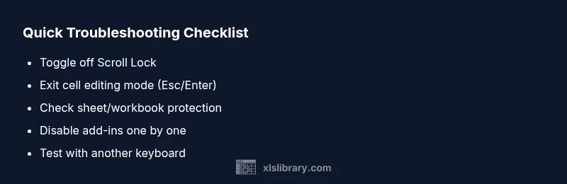 Excel not working with arrow keys? Quick fix: confirm Scroll Lock is off, exit edit mode, and disable any active workbook protection. If the issue persists, run through the diagnostic flow to identify add-ins or OS-level keyboard settings. This XLS Library guide will help you restore navigation fast.