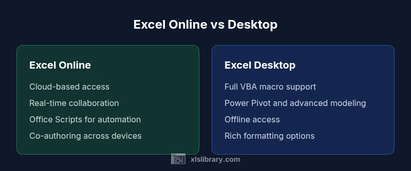 Automation is a critical area where Desktop shines. Excel Desktop supports VBA macros, the Visual Basic for Applications editor, and a wide ecosystem of macro-enabled templates and add-ins. Office Scripts are available in Excel Online; they provide a modern automation approach but are not a direct replacement for VBA in all scenarios. Cloud automation is great for repeating tasks, but some complex scripts or add-ins rely on desktop-only APIs. If automation is central to your workflow, plan for a hybrid approach: design and test in Desktop, then automate in Online where possible and share scripts via cloud storage.
