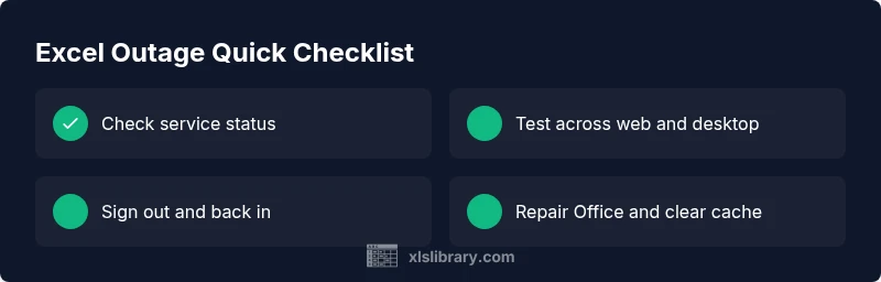 An Excel outage can mean different things: the desktop application fails to start, Excel Online won't load a workbook, or dashboards that rely on Excel data sources go offline. According to XLS Library, outages often split into two broad categories: service-wide outages on Microsoft's end and problems tied to your local network or account. Start by distinguishing between these two to avoid chasing a local fix when the problem is global. If multiple users report the same issue, the culprit is more likely a service disruption rather than something on your machine. On the other hand, if only one device or one workbook is affected, you can narrow the scope quickly by testing alternatives (web vs desktop, another file, or another account).