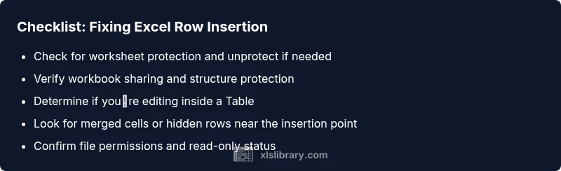 According to XLS Library, the most common reasons Excel wont let you insert a row are worksheet protection, workbook sharing, and operating on a structured Table. When a sheet is protected, insert options are disabled until you supply a password. A table can also restrict where you add rows, and permissions issues can block edits even on an unprotected sheet. Understanding these core scenarios helps you decide what to test first and reduces wasted time.