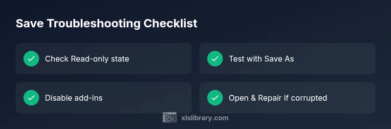 When you run into an error like excel won't let me save, it’s usually environmental rather than a single corrupt file. The error typically falls into a handful of predictable categories: file permissions, disk space and Temp directory state, workbook integrity, and active add-ins or macros. The XLS Library team emphasizes that most save-blocks are solvable with a systematic check of the basics before diving into advanced repairs. Start with the simplest items—file attributes, the save location, and the immediate file state—then expand to environment and software configuration if needed. This approach keeps you from chasing phantom causes and protects your data with practical, repeatable steps.