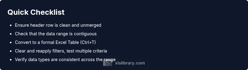Before you jump into complex fixes, run through a short checklist. Confirm that you are filtering the correct data range, and that your headers are clearly defined with no merged cells in the header row. Ensure the range includes all relevant rows and columns and that there are no hidden rows or columns within the filter scope. If you’re using an Excel Table, verify that the table range matches the data you intend to filter. These quick checks often resolve the issue with minimal disruption.