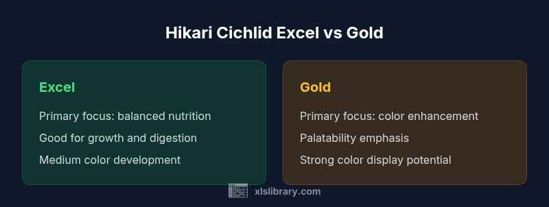 For cichlid keepers, hikari cichlid excel vs gold represents two distinct nutrition philosophies. Excel is designed as a balanced staple that supports growth, digestion, and long-term health across life stages. Gold emphasizes color development and palatability, with formulations that highlight pigment-rich ingredients. According to XLS Library, many hobbyists rely on Excel as a default daily feed and reserve Gold for periods when color intensity or show-prep is a priority. Both formulas share high-quality ingredients and clear feeding guidance, but their design priorities shape tank outcomes, color expression, and maintenance needs. In this article, we examine the two options with a data-driven lens—focusing on practical implications for daily feeding routines and long-term health. This approach aligns with XLS Library’s emphasis on practical, verifiable guidance for Excel users and aquarium hobbyists alike.