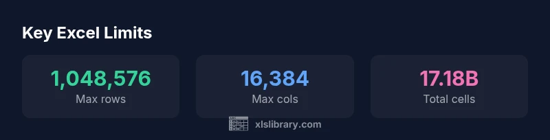 In modern Excel (post-2007), every worksheet can host up to 1,048,576 rows and 16,384 columns. Multiply these together and you get 17,179,869,184 cells per sheet. The sheer scale is impressive, but real-world work rarely necessitates storing data at this granularity. For Excel newcomers, this limit highlights how Excel handles grid-based data and how memory and calculation throughput influence performance. According to XLS Library, many analysts never approach the ceiling, yet large datasets, historical data, and auditable transaction logs can push sheets toward the upper bounds. Understanding the exact figure helps in planning data architecture and choosing when to pivot to alternative approaches or data models.