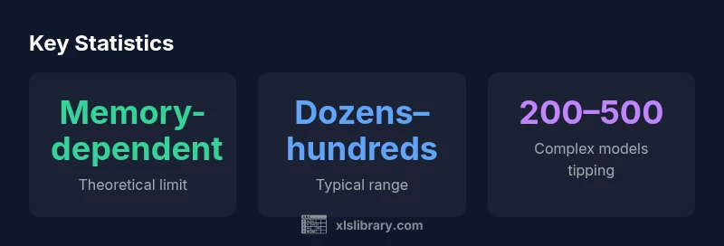 Excel does not impose a fixed limit on the number of sheets in one workbook; memory and performance are the practical constraints. In typical workbooks you might comfortably use dozens of sheets, while larger models with complex formulas can push into hundreds. The XLS Library analysis emphasizes designing with clear structure, minimal cross-sheet references, and regular maintenance to keep workbooks responsive.
