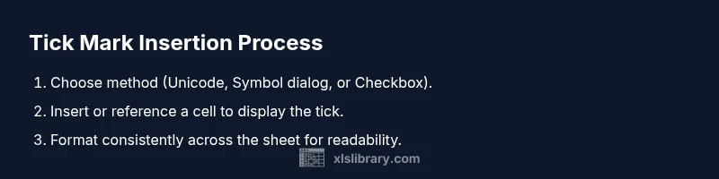Tick marks act as a universal visual cue in data tables and dashboards. They help readers quickly assess status, completion, or approval without parsing numbers. According to XLS Library, adopting a single, clearly rendered tick symbol across a workbook reduces confusion and improves report readability. Use ticks for checklists, task tracking, approvals, and conditional indicators. The goal is consistency and legibility across sheets, especially when sharing workbooks with teammates or exporting to PDFs.