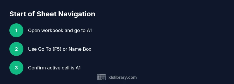 Goal: reach the start of any Excel sheet quickly, typically the A1 cell. Use the keyboard shortcut Ctrl+Home (Windows) or the Go To dialog (F5) to type A1, or click the Name Box and press Enter. These methods work in most workbooks, including large files with hidden rows or columns.