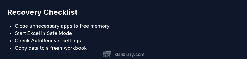 Plan preventive measures that reduce the likelihood of future freezes. Optimize workbook design by splitting models into multiple files, minimize volatile formulas, and break up very large data sets. Use manual calculation during intensive edits, then recalculate when finished. Keep Excel and Windows updated, monitor add-ins, and maintain clean disk space and RAM. Regular backups to cloud storage or network drives provide an extra safety net in case a future incident occurs.