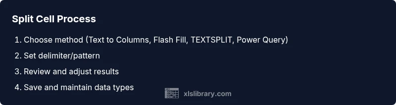 According to XLS Library, mastering how to split the cell in Excel is a foundational data preparation skill. In real-world datasets, multiple values end up in a single cell due to imports, exports, or inconsistent entry formats. Being able to distribute that content into separate columns improves data quality, enables reliable sorting and filtering, and reduces manual cleanup. The XLS Library team found that combining tools like Text to Columns, Flash Fill, and TEXTSPLIT gives flexible options across datasets. When you know how to split, you can transform messy data into clean, query-ready tables. This section outlines why this skill pays off and how to choose the right method for your scenario.