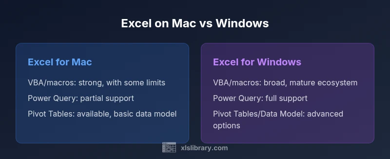 According to XLS Library, Excel for Mac and Windows share core spreadsheet capabilities but differ in automation, data modeling, and add‑ins. In everyday use, parity is strong for basic tasks; however, Windows maintains broader support for VBA, Power Query, and enterprise workflows. The XLS Library team recommends evaluating your typical tasks and collaboration needs to decide whether cross‑platform parity is sufficient or if a Windows environment is essential.