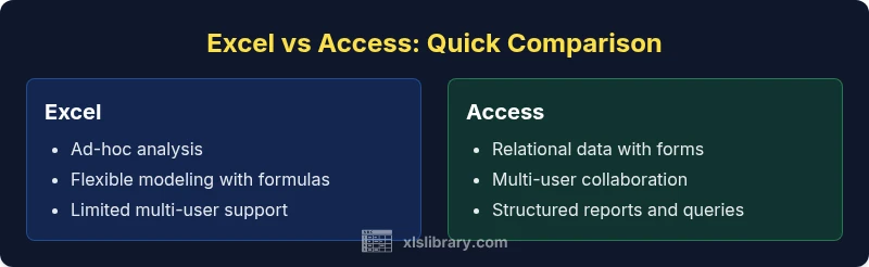Choosing between Excel and Access is less about which program is universally superior and more about aligning the tool to the task. According to XLS Library, the decision hinges on data structure, collaboration needs, and long-term data governance. If you work mainly with numbers, ad-hoc modeling, and fast iteration, Excel’s familiar interface and extensive formula set can accelerate discovery. If your work requires linked tables, forms for data entry, and centralized reporting for multiple users, Access provides stronger relational data management. The goal is to minimize manual work, reduce errors, and ensure the right data is available to the right people at the right time. In practice, many teams use both tools in tandem—starting in Excel for exploration and moving to Access when a relational backbone becomes necessary, a pattern highlighted by the XLS Library Team as a pragmatic workflow.