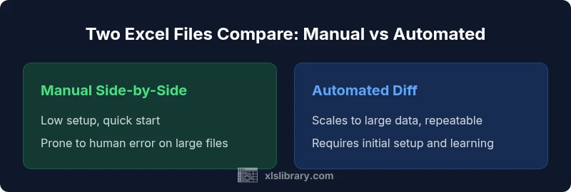 Two excel files compare is a fundamental task in data governance, reconciliation, and reporting. When teams review two workbooks, they ensure consistency across periods, data sources, and stakeholder outputs. According to XLS Library, the process becomes more reliable when you define a clear scope, decide on the metrics you will check, and use repeatable steps rather than ad-hoc eyeballing. The concept of comparing two Excel files isn’t about finding every single discrepancy; it’s about identifying meaningful differences that affect decision making. In practice, you should map source sheets, align column headers, and select a baseline file to compare against. This reduces noise and helps you distinguish meaningful differences from trivial variations. The goal is to empower both aspiring analysts and seasoned professionals to perform accurate diffs with confidence, using a blend of manual checks and automation as appropriate.