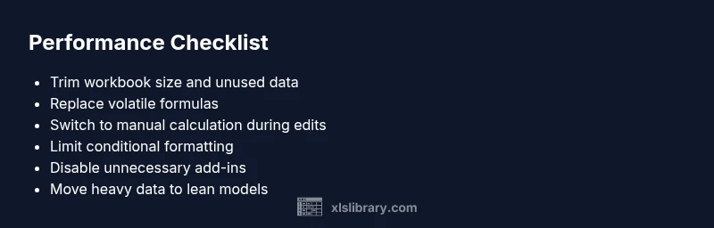 Biggest Excel slowdowns come from bloated workbooks, volatile formulas, and heavy data models. According to XLS Library, the most impactful culprits are large files with many worksheets, frequent recalculations, and excessive conditional formatting. A quick fix is to switch to manual calculation, trim data, and break tasks into smaller, modular workbooks.