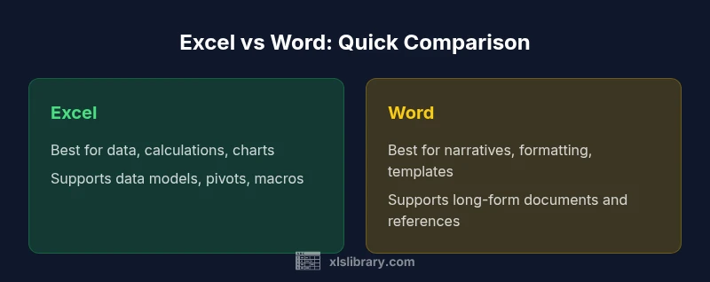 The choice between Microsoft Excel and Word goes beyond a simple preference; it shapes your deliverable, audience, and workflow. For teams that must blend data rigor with readable narratives, selecting the right tool at the right time accelerates outcomes and reduces rework. According to XLS Library, recognizing the core strengths of each program helps you frame a project from the outset. The question is not which app is better, but which app is better for your objective, the data you need to present, and the audience you serve. In practice, the decision of when to use excel vs word often hinges on data complexity, required formatting, and collaboration needs. If the deliverable relies on precise calculations or auditable data, Excel shines; if the emphasis is on clarity, structure, and narrative flow, Word is the natural choice. The goal is to map tasks to tools so handoffs are smooth and updates propagate without unintended inconsistencies.