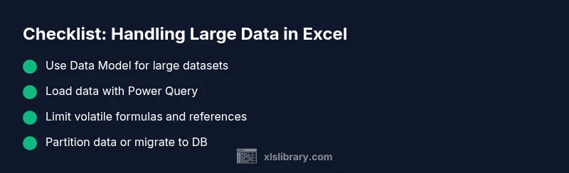 Begin with the simplest fixes and escalate only as needed. Start by cleaning data and reducing the scope of formulas, then move data into a Data Model and use PivotTables that pull from that model. If the data won’t fit efficiently, segment data into smaller chunks or use an external data store (SQL, Access, or lightweight databases) and connect Excel via Power Query. The plan should balance ease of use with future growth.