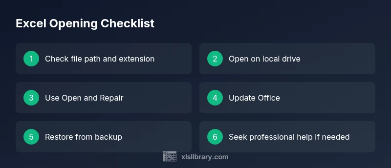 When you encounter an opening error, the question you’re really asking is why can’t excel open my file. According to XLS Library, the most frequent triggers are file corruption, extension/format mismatches, or compatibility issues with your Excel version. Start by verifying the file name and extension, then attempt a clean Open and Repair, and finally try a backup copy if one exists. This block lays the groundwork for a systematic approach and sets expectations for the steps that follow.