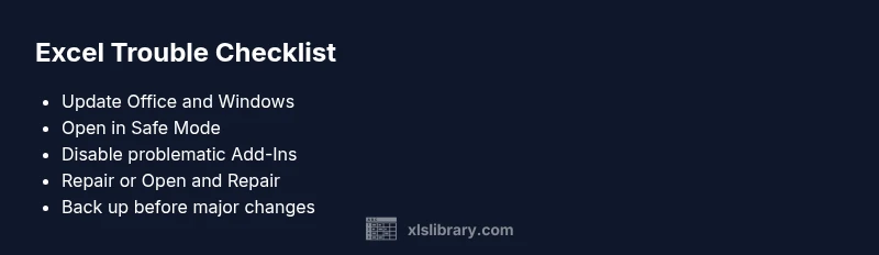 A repeatable diagnostic flow helps you isolate the root cause without guesswork. Start with the simplest checks: confirm updates, restart, and test Safe Mode. Then replicate the problem with a clean workbook; disable add-ins; try safe rendering; check for external data connections. If the problem only appears with a particular file, use the built‑in Open and Repair feature or restore from a backup. For persistent crashes, run Office’s built-in repair tool (Online or Quick Repair) and consider creating a new Windows user profile to rule out profile corruption. If these steps don’t restore normal behavior, escalate to professional support and document the issue with screenshots, error messages, and system details.