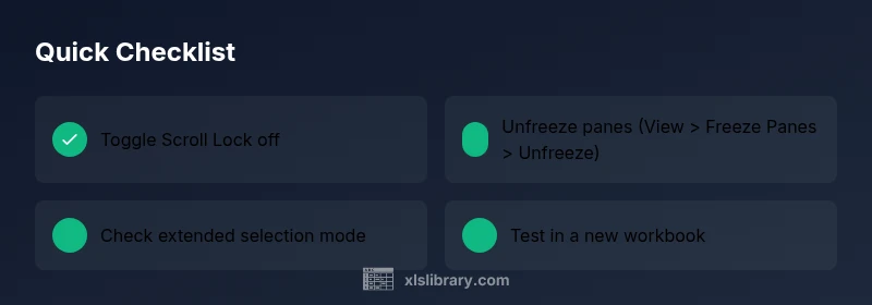 Before you dive into deeper diagnostics, run a few fast checks to rule out the simplest causes. First, look for the Scroll Lock indicator on your keyboard or screen; if present, toggle it off. Second, inspect the View tab to see if Freeze Panes is active and unfreeze if needed. Third, press Esc to exit any active selection or drag mode. If you still notice unexpected scrolling after these steps, try selecting a small range and attempting to move it again to confirm whether the behavior persists. Finally, ensure you’re not in a different worksheet or workbook that may have its own scroll settings.