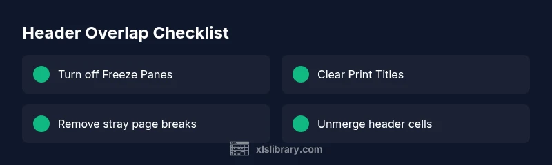 The header overlap in Excel is usually caused by print settings, Freeze Panes, or stray page breaks. Quick fixes: turn off Freeze Panes, reset Print Titles, and remove manual page breaks, then re-check the view. If the issue persists, save, reopen, and apply a clean print area to prevent recurrence.