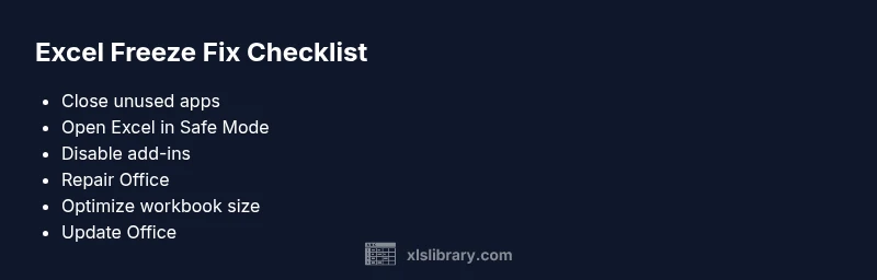 Before diving into deeper fixes, try these safe, low-friction checks that often resolve freeze issues: 1) Save and restart Excel, then reopen the affected workbook. 2) Open Excel in Safe Mode (hold Ctrl while launching). 3) Disable non-essential add-ins and restart. 4) Move the workbook to a fast local drive and ensure enough disk space. 5) Enable Manual Calculation to limit ongoing recalculation while you diagnose.