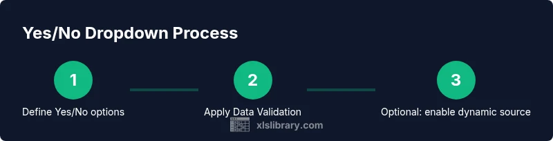A yes/no drop-down is a compact data-validation pattern that controls input to two mutually exclusive options. When you provide Yes and No as the only allowed entries, you prevent typos and inconsistent capitalization that often break data analysis. According to XLS Library, these dropdowns are a foundational technique for maintaining clean data across worksheets and projects. The phrase yes no drop down in excel is common in practical tutorials because it directly addresses everyday data-entry challenges. This section lays the groundwork by clarifying what the dropdown does, why it matters for data integrity, and how it fits into larger data models. The goal is to empower you to implement a reliable control that scales from a single cell to an entire column or table. With a robust setup, you’ll reduce cleanup time and improve consistency across your analyses.