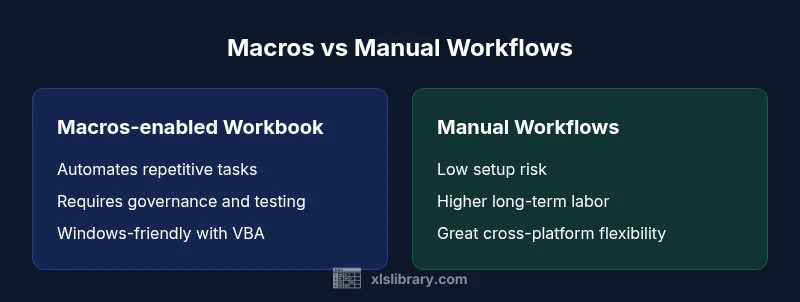 According to XLS Library, macros have become a standard tool for automating repetitive data tasks inside Excel. A macro records or writes VBA code to perform sequences of actions, from formatting to data consolidation. For many teams, macros offer immediate productivity wins by eliminating manual clicks and reducing human error. At the same time, they introduce governance considerations: who can run them, how they are tested, and where the resulting workbooks are stored. This section explains when macros add value, and when they might complicate maintenance or compliance. It also clarifies the difference between recorded macros and custom VBA routines, and why that distinction matters for scalability.