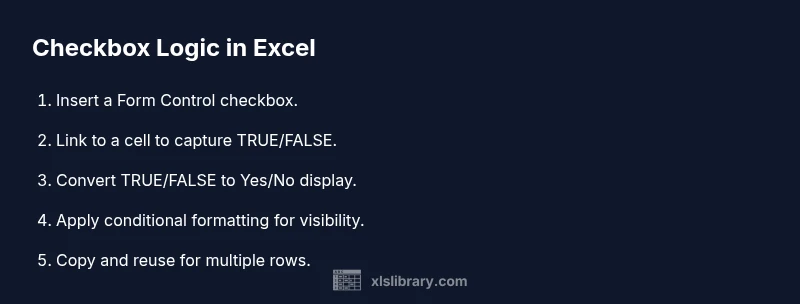 According to XLS Library, a yes/no checkbox in Excel is a binary control that lets users indicate a choice with a single click. When used as a form control, the checkbox writes a TRUE or FALSE value to a linked cell. If you prefer a more human-friendly display, you can convert that TRUE/FALSE result into Yes/No with a simple formula. This approach is widely used in dashboards, task lists, surveys, and wherever binary input improves data quality. The XLS Library team emphasizes practical, approachable guidance, so you can implement this quickly without needing macros or complex scripts.