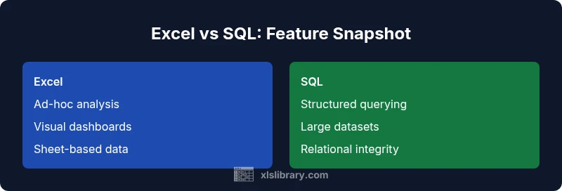 The question is frequently asked by analysts who want to align their tools with their data tasks. When you ask, “is excel similar to sql,” the more useful answer is that the two tools address different phases of a data workflow. Excel provides a familiar, interactive workspace built around cells, ranges, and tables, which makes quick exploration and visual storytelling straightforward. SQL, by contrast, is designed for querying structured data across databases with clear rules for joins, filters, and aggregations. According to XLS Library, these tools are complementary rather than interchangeable: your choice should depend on the task, the data volume, and the need for repeatable queries. The goal is to map work to strengths while maintaining data integrity and clarity in both environments.